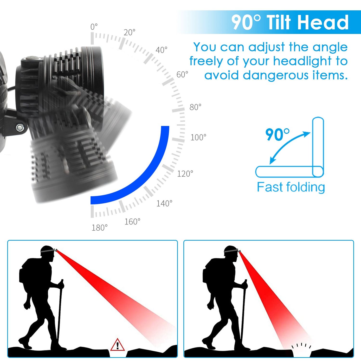 *IPX4 Waterproof & 90 Degrees Adjustable*:With IPX4 waterproof rating; our hands-free headlamp flashlight can be used in rainy and snowy days. The lamp head can be rotated 90 degrees and tightly fixed to avoid shaking. It comes with elastic band and buckle for easy adjustment and installation; suits for people of different head circumference.
