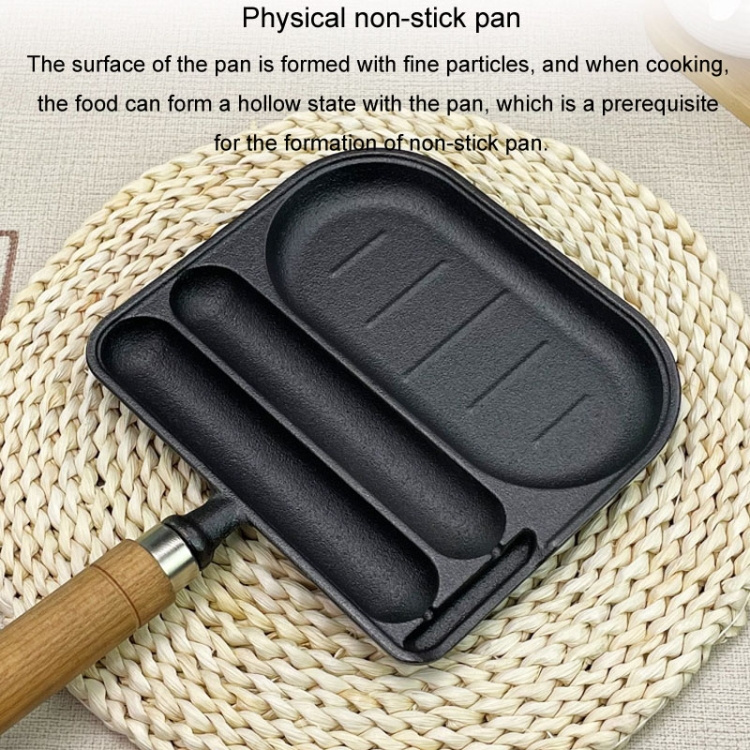 Size: sausage grill about 16.5 x 3 cm, omelette grill about 8.5 cm in diameter, frying meat grill about 18 x 8.5 cm, single hole depth about 1.6 cm, pan height about 2 cm.