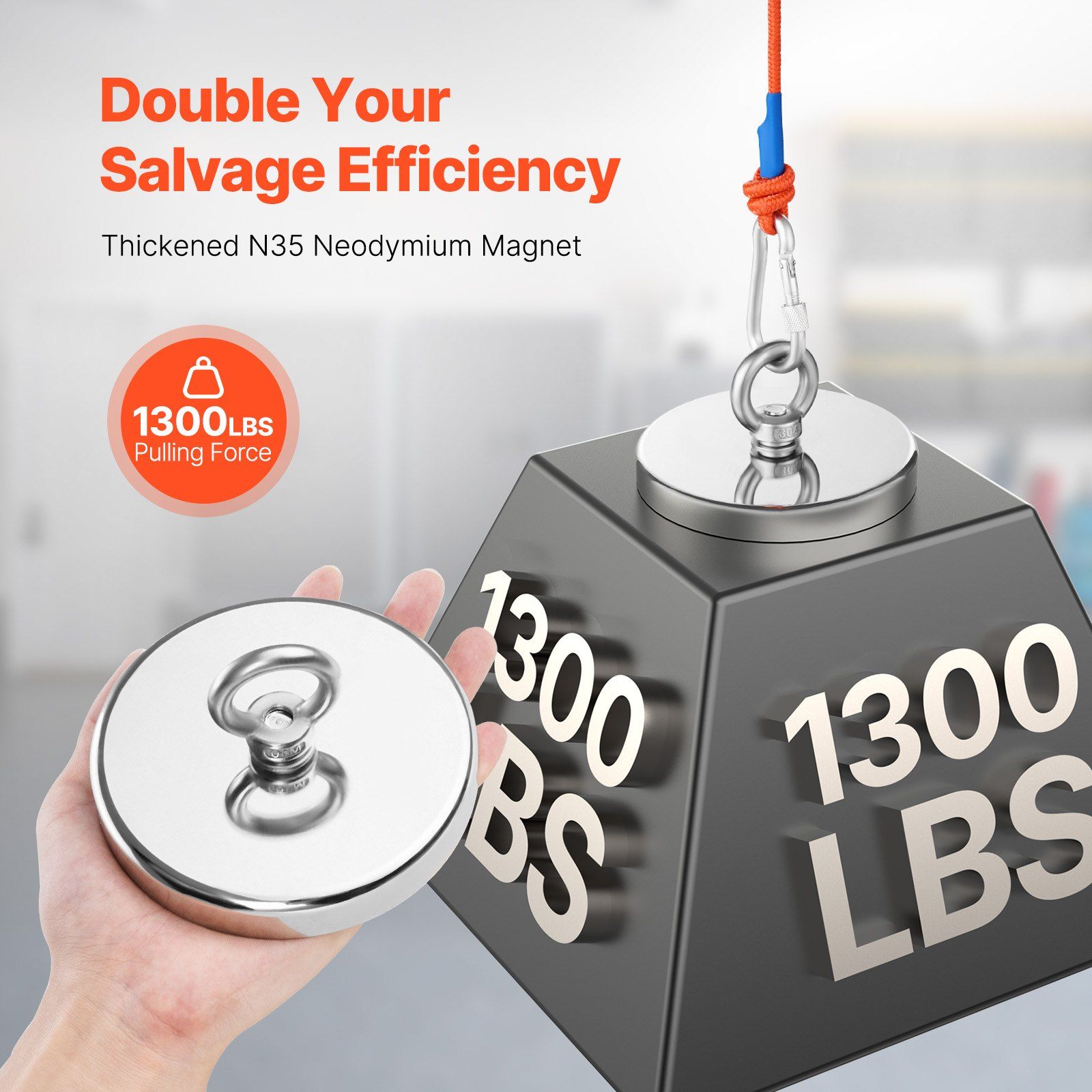1300 LBS Strong Fishing Magnet Kit Single Sided Pull Force and Rope Carabiner